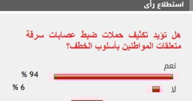 وأيد 94% من القراء تكثيف حملات ضبط عصابات سرقة متعلقات المواطنين بأسلوب الخطف، بينما رفض 6% موضوع الاستطلاع.